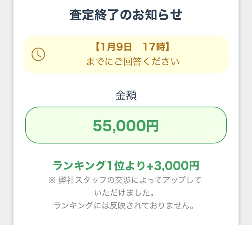 今回、状態が悪かったのですがもう少し金額を上げたかったので交渉してもらったところ3000円の値上げに成功しました。